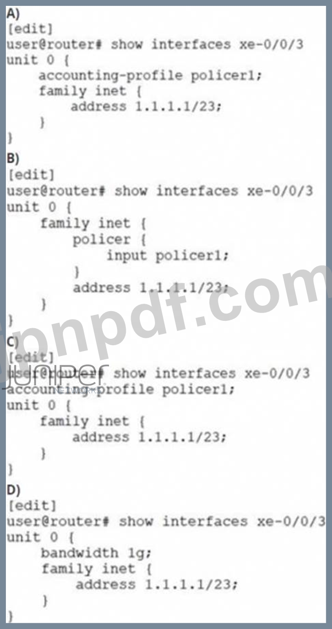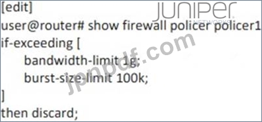 展示に示されているポリサーを使用して、インターフェイスxe-0/0/3のトラフィックを1Gに制限するように求められます。