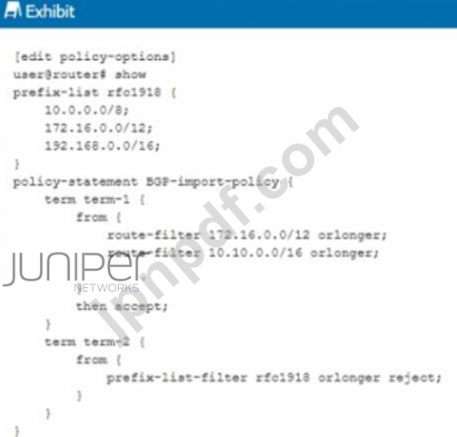 展示に示されているポリシーをインポートポリシーとしてBGPグループに適用しました。このシナリオでは、ルーターが192.168.30.48/32ルートを受信するとどうなりますか。