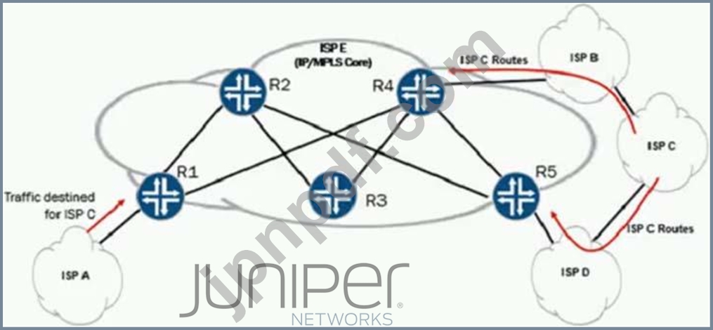 展示を参照すると、ISPCとISPAの間のトラフィックがISPBを通過することを保証するために、ISPEの設計者が使用する2つの方法はどれですか。(2つ選択してください。)