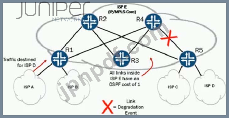 ISP E内では、R1は、R1-R2-R5およびR1-R4-R5パスを介してISPD宛てのロードバランシングトラフィックです。ある時点で、展示に示されているように、ネットワークでリンク劣化イベントが発生します。R1がパス障害を迅速に学習するようにします。
