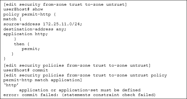 プライベート172.25.11.0/24サブネットからインターネットへのHTTPトラフィックを許可するセキュリティポリシーをSRXシリーズデバイスに作成しようとしています。HTTPトラフィックを許可するtrustゾーンとuntrustゾーンの間にpermit--httpという名前のポリシーを作成します。