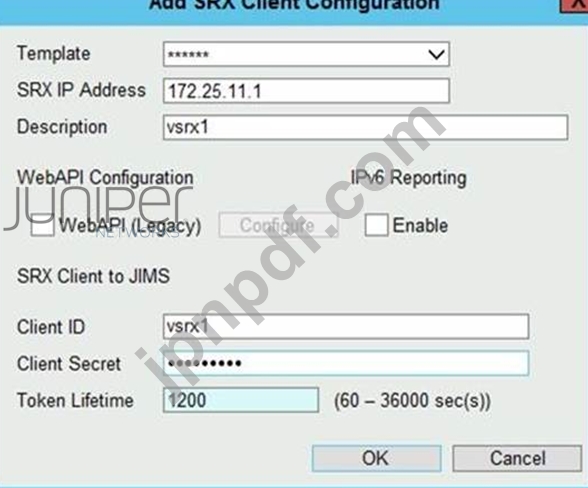 展示を参照すると、JIMS SRX クライアント設定の 2 つの値が SRX クライアントで設定された値と一致する必要があるのはどれですか? (2つお選びください。)