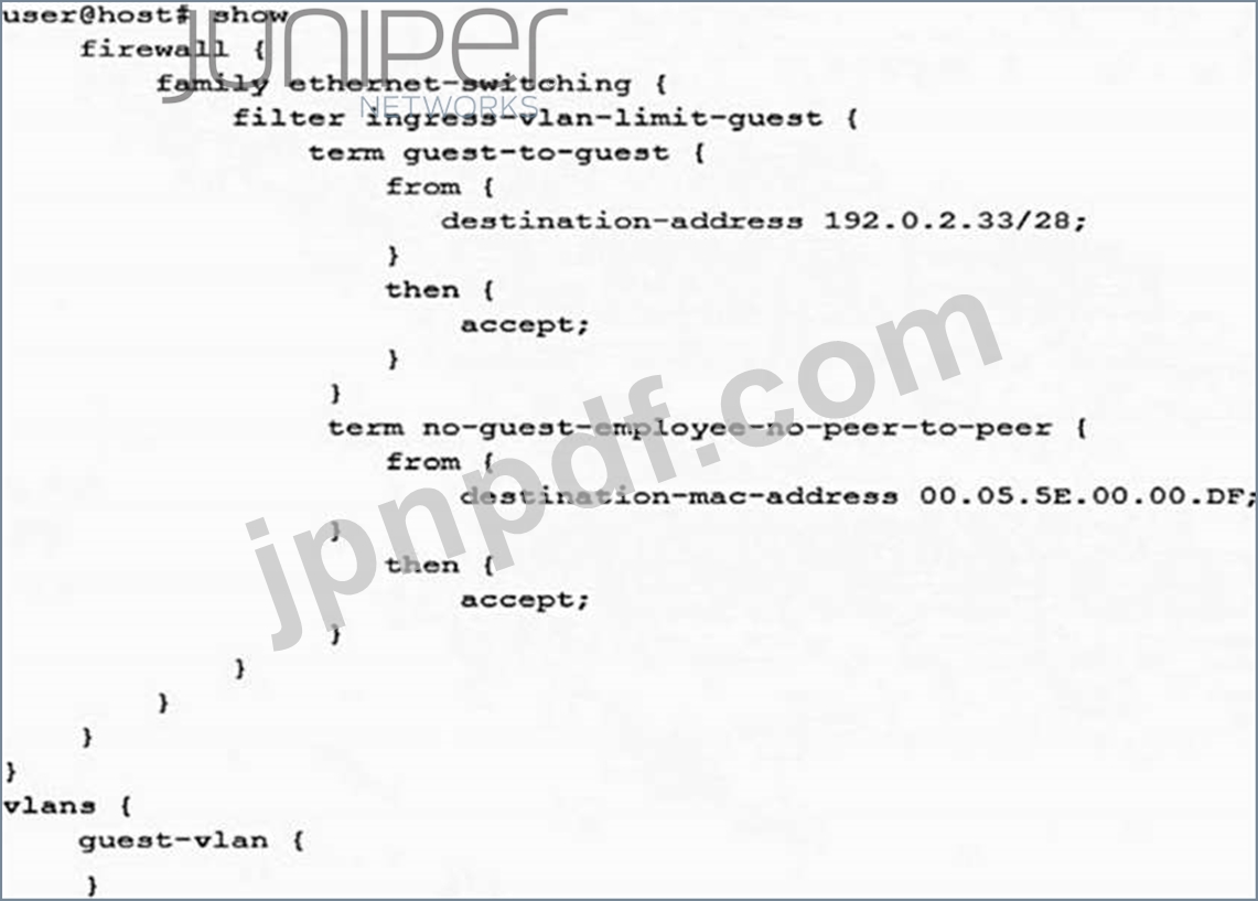 最近のセキュリティ監査では、ピアツーピアアプリケーションがゲストVLANで許可されており、従業員がこの目的でゲストVLANを使用している可能性があることが示されています。展示に示されている構成を展開しますが、ピアツーピアトラフィックは停止しません。