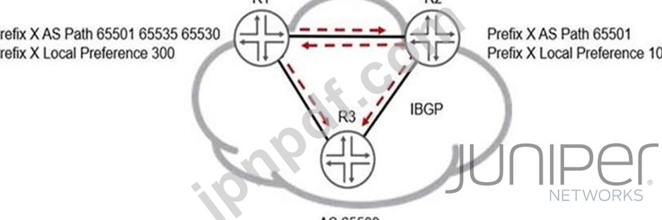 R1デバイスとR2デバイスの両方が、展示に示されているBGP属性を使用してプレフィックスXをAS65530にアドバタイズしています。