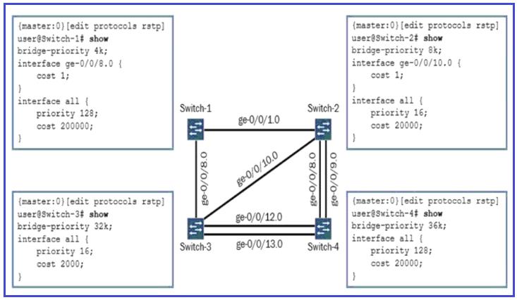 展示を参照すると、Switch-4 の RSTP ルート ポートとしてどのポートが選択されますか?