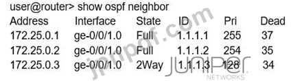 展示を参照すると、ge-0/0/1 インターフェイスの正しい OSPF インターフェイス状態は何ですか?
