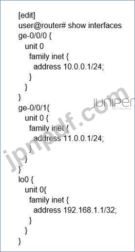 インターフェイス ge-0/0/0.0 は、ネットワークを ISP に接続します。ISP とのネイバーを作成せずに、このインターフェイス アドレスを OSPF の内部ルートとしてアドバタイズしたいと考えています。