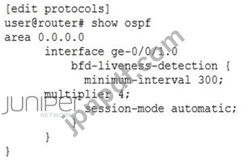 展示を参照すると、インターフェイス ge-0/0/1.0 がダウンしているとみなされるまでに何ミリ秒が経過する必要がありますか?