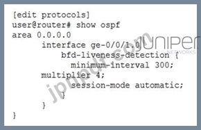 展示を参照すると、インターフェイス ge-0/0/1.0 がダウンしているとみなされるまでに何ミリ秒が経過する必要がありますか?
