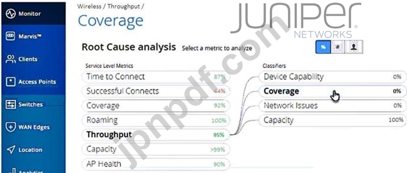 展示物を参照すると、Mist UI のスループット SLE の一部として、カバレッジ分類子はどのデバイスの信号強度を示しますか?