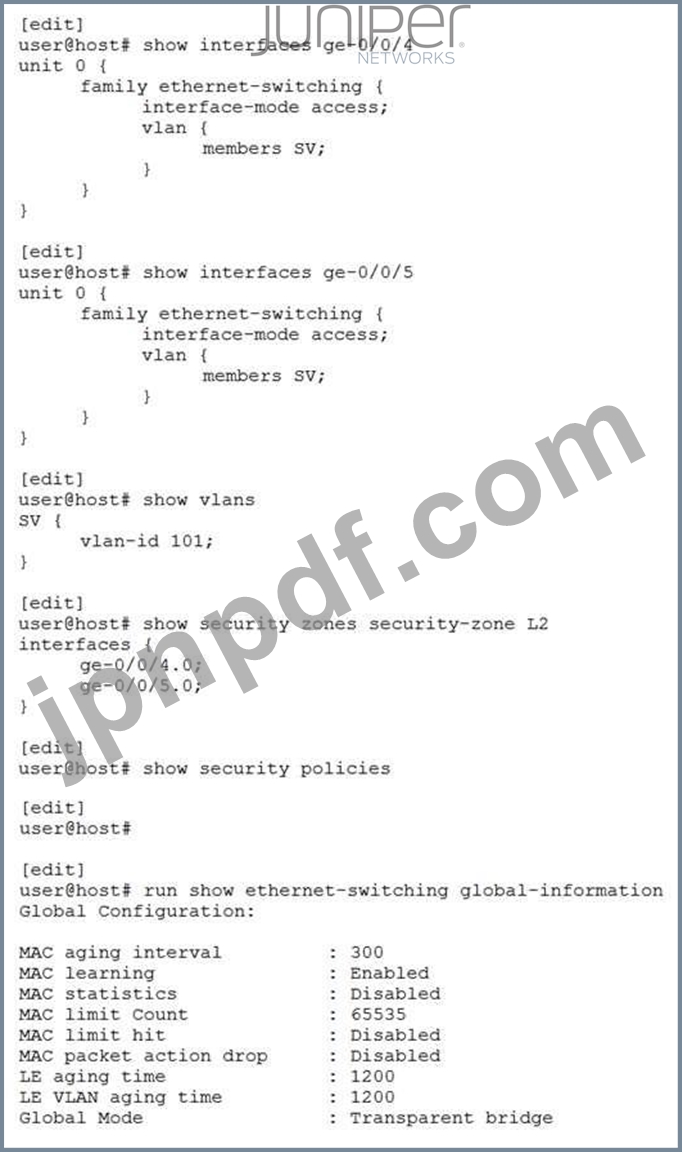 同じサブネット上に2つのホストがあり、インターフェースge-0/0/4およびge-0/0/5でSRX340に接続しています。