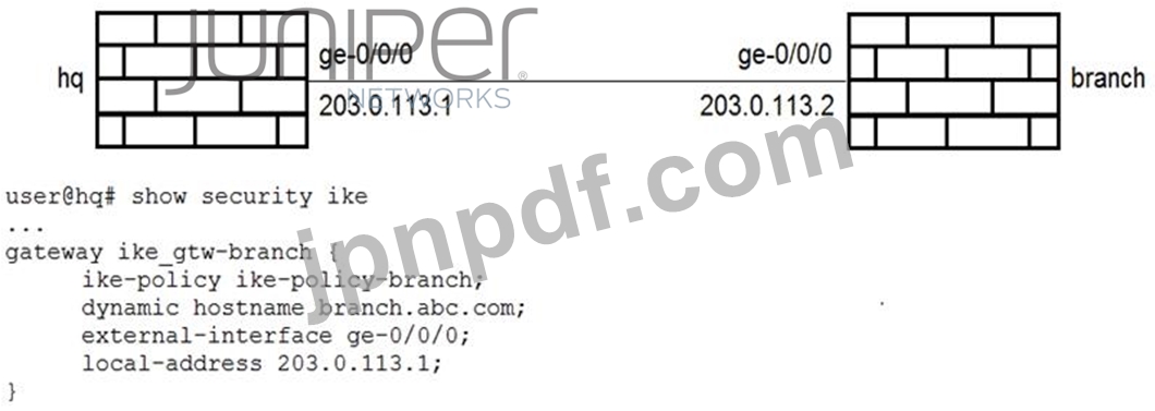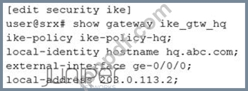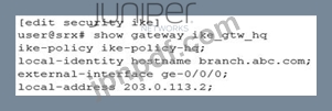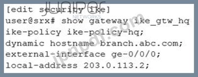 展示に示されているように、IKEポリシーと提案は両方のデバイスで適切に構成されています。ブランチSRXシリーズデバイスでIKE構成を完了する構成スニペットはどれですか?