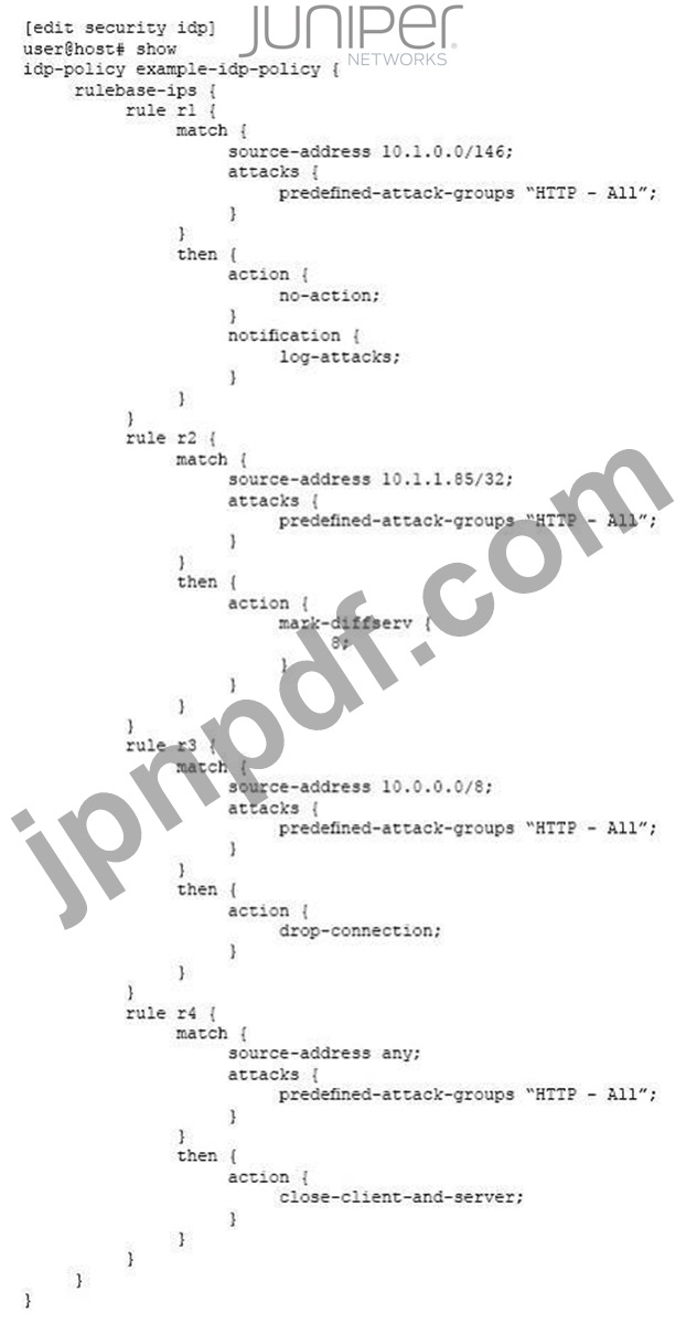 展示を参照すると、IPアドレス10.1.1.85のユーザーは、「HTTP-All」事前定義攻撃グループのメンバーであるHTTP:EXT:DOT-LNKIDP署名をトリガーする要求を生成します。