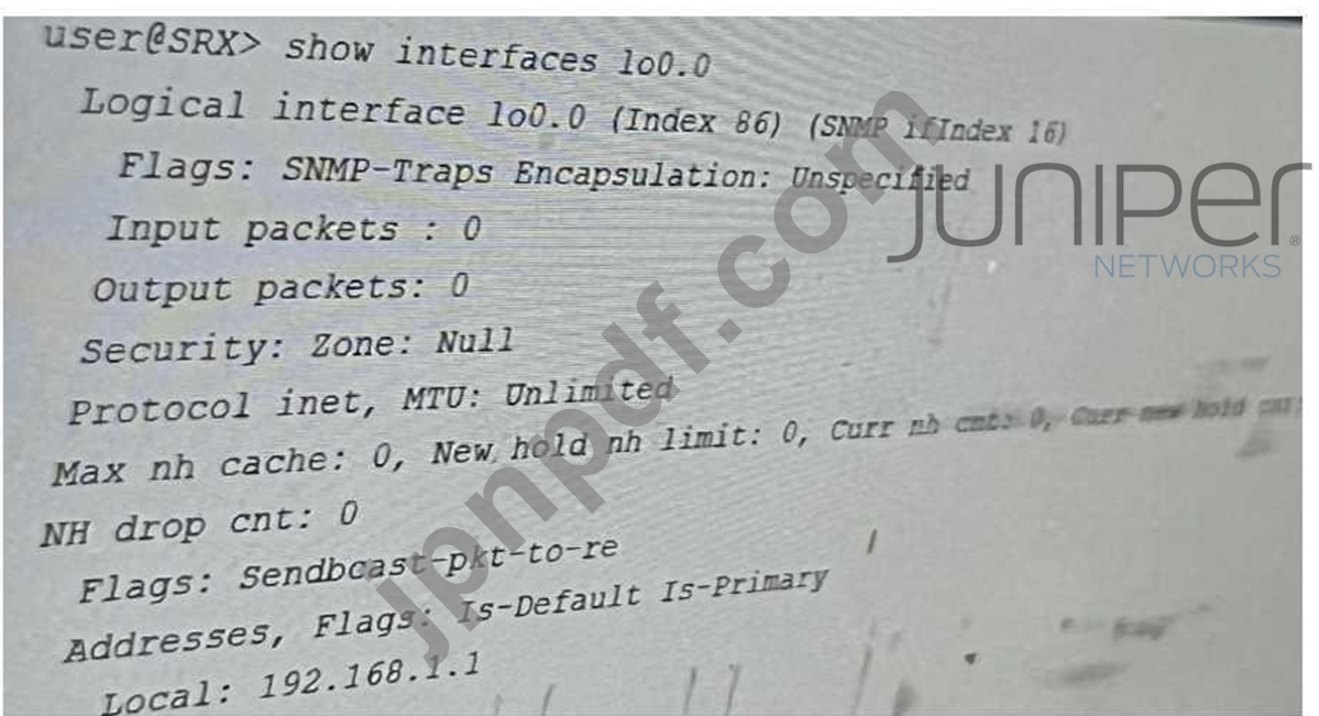 図に示されている SRX シリーズ デバイスのループバック インターフェイスに割り当てられている IP アドレスに ping を実行しようとしています。