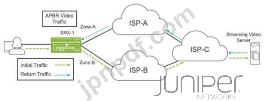 図を見ると、SRX-1 のデフォルトのスタティックルートはすべてのトラフィックを ISP-A に送信しています。APBR は、ストリーミングビデオトラフィックのすべてのリクエストを ISP-B に送信するように設定されています。しかし、ストリーミングビデオサーバーからの戻りトラフィックは ISP-A を経由しており、SRX-1 でドロップされています。変更できるのは SRX-1 のみです。