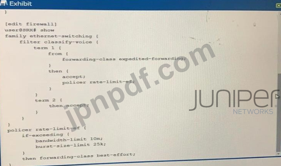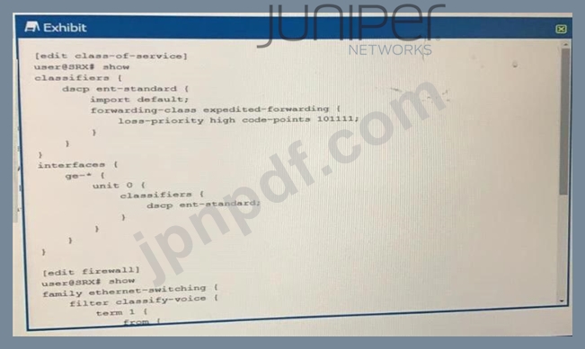 パケットにDSCPコードポイント101111でラベルを付けるカスタムアプリケーションにCoSを実装しています。展示に示されている構成を適用しましたが、ge-0/0/1の一部のカスタムアプリケーショントラフィックがSRXを通過している間は適用していません。直列デバイスは正常に動作し、他のすべてのge-*インターフェイスに侵入するパケットはドロップされます。