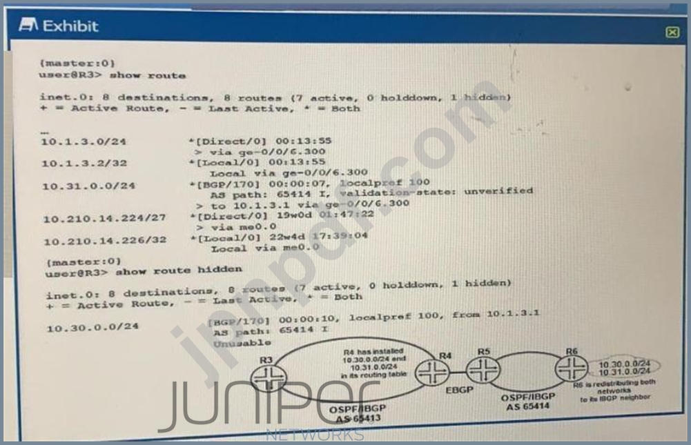 展示に示されているトポロジーのルート問題のトラブルシューティングを行っています。10.30.00/24ルートにR3ルーターから到達できません。この問題の原因は何ですか?