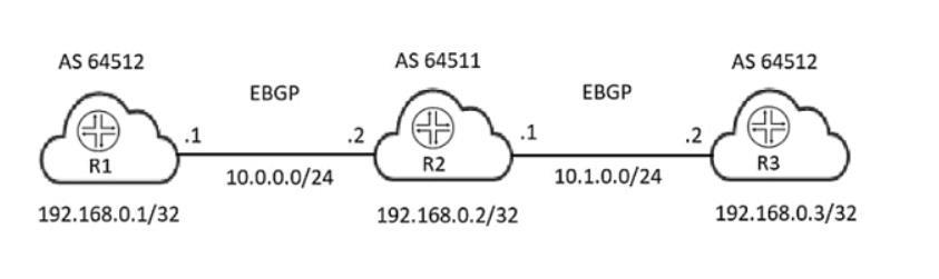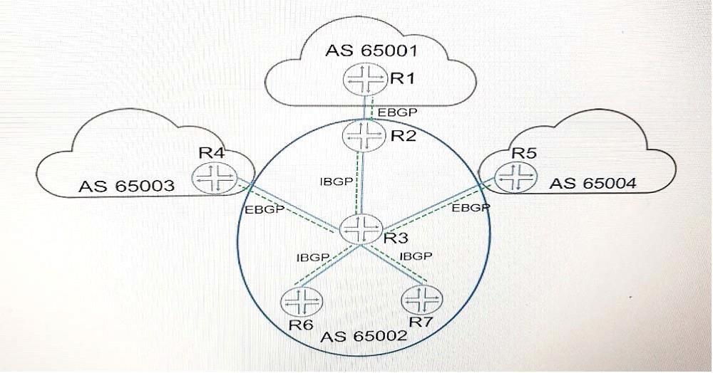 Router R1, in peer AS 65001, advertises routes to R2 using EBGP. R2 advertises the routes learned from R1 to R3 using IBGP.