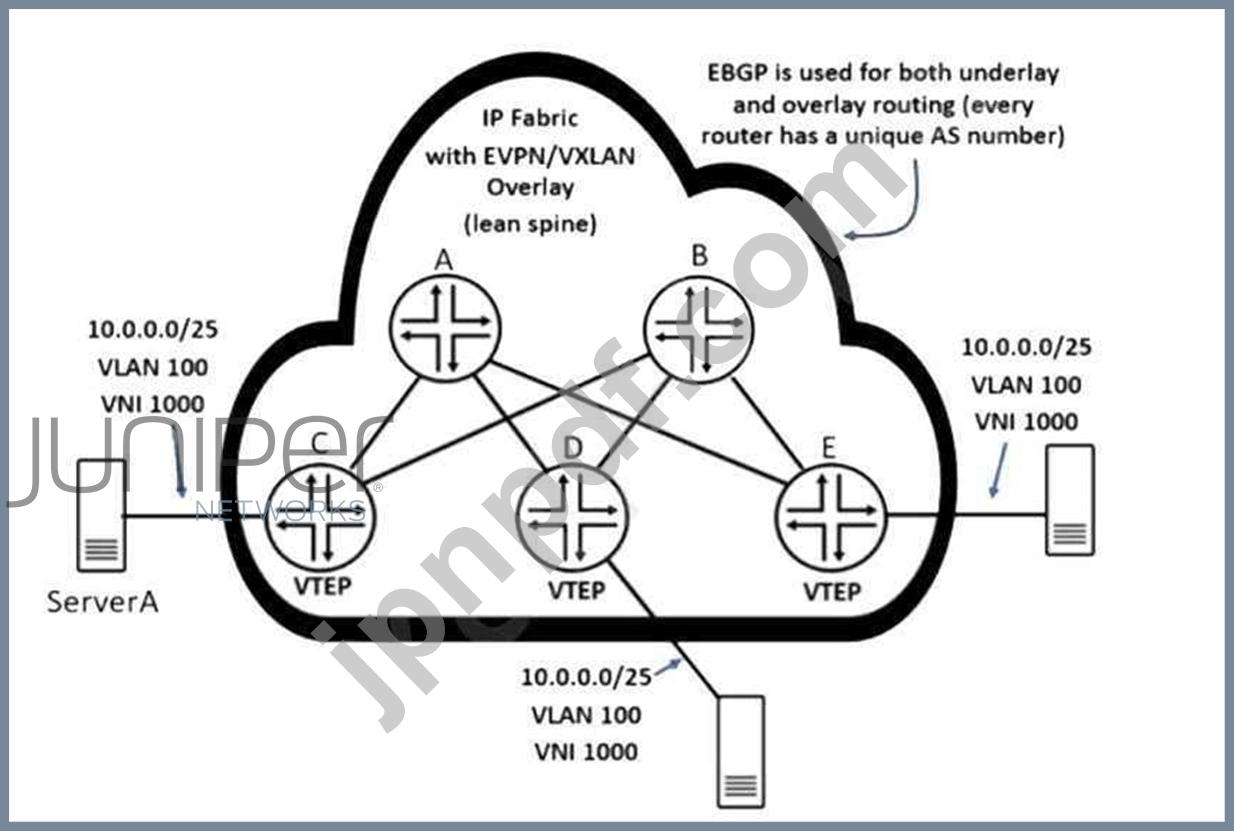 展示を参照すると、ServerA は 10.0.0.127 宛ての単一の IP パケットを送信します。10.0.0.127 宛ての元のパケットを含む、結果として生じるアウトバウンド VXLAN パケットの動作を正しく説明している 2 つのステートメントはどれですか? (2つお選びください。)