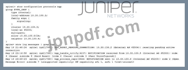 ルート リフレクタとして構成された EVPN スパイン スイッチと IP アドレス 10.30.100.6 のリーフ ノードの間の接続のトラブルシューティングを行っています。
