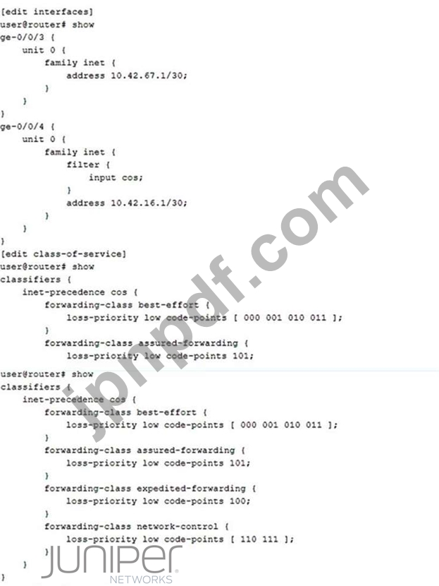 この図を参照すると、トラフィックはインターフェイス ge-0/0/3 で受信され、インターフェイス ge-0/0/4 で送信されます。