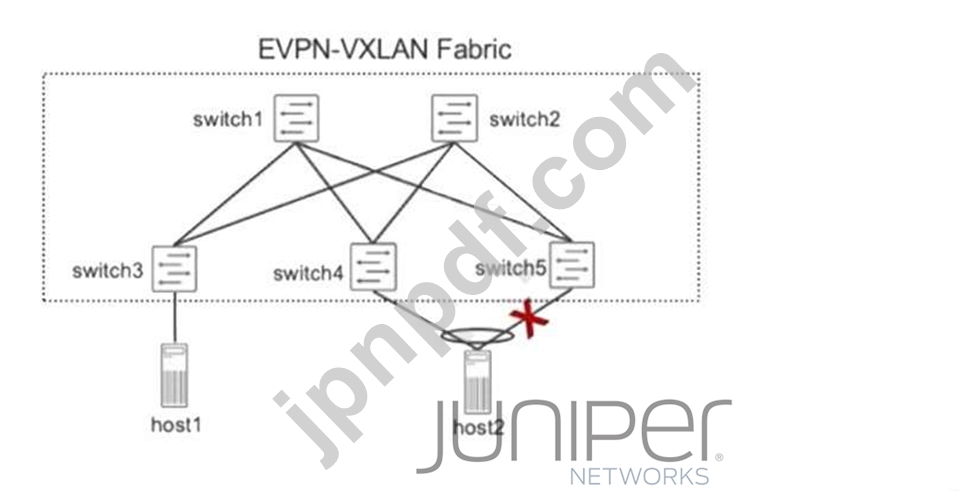 展示を参照すると、この EVPN-VXLAN ファブリック上の host2 と switch5 の間のリンクに障害が存在する場合、正しい記述はどれですか?