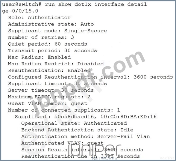 ex シリーズ スイッチに接続されているユーザー デバイスを認証しています。すべてのポートに 802.1X と MAC RADIUS が設定されています。ユーザーは、MAC RADIUS 認証を使用して ge-0/0/15 に非 802.1X デバイスを接続するのに時間がかかると不満を抱いています。