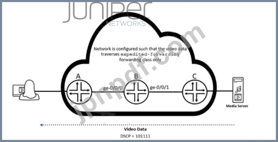 ユーザーは、メディア サーバーからネットワーク経由でストリーミングされている高解像度ビデオを視聴しようとしています。しかし、ユーザーは体験したビデオの品質が低いと不満を抱いています。ルーター B (ジュニパーネットワークス デバイス) にログオンしているときに、ビデオ パケットがドロップされていることに気づきました。