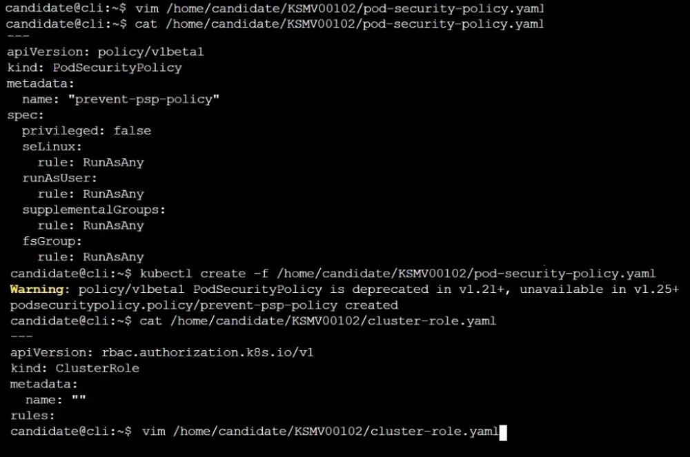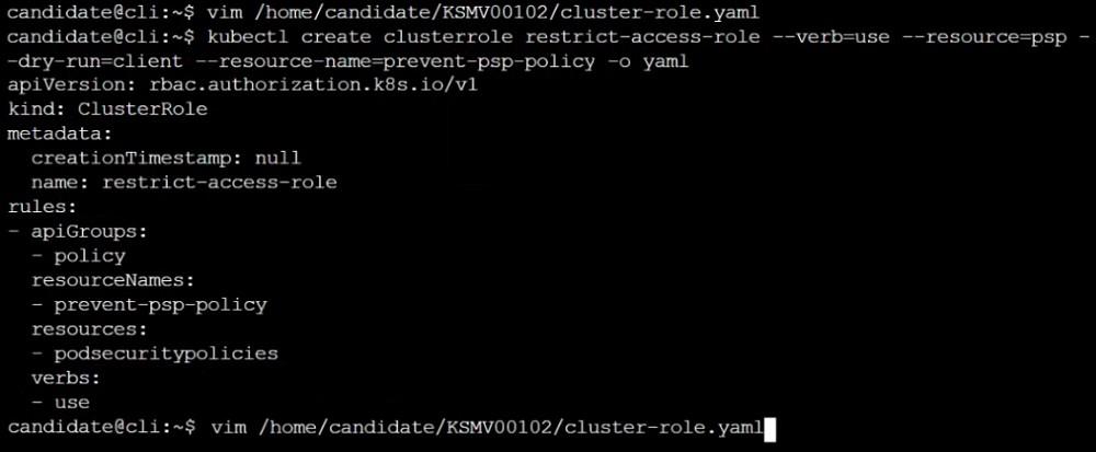 Create a new ClusterRole named restrict-access-role, which uses the newly created PodSecurityPolicy prevent-psp-policy.