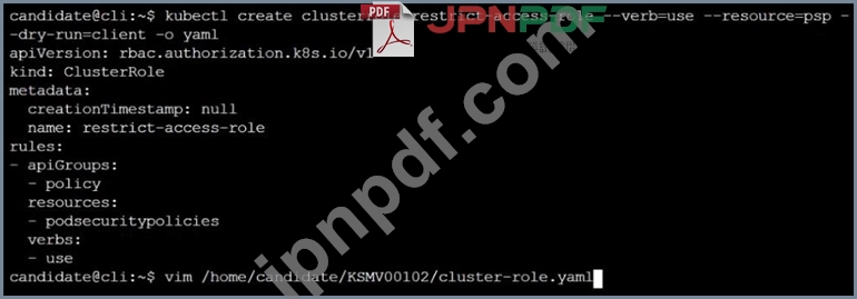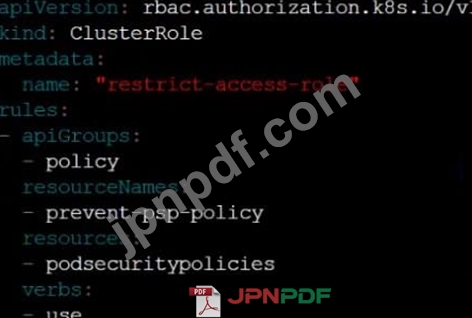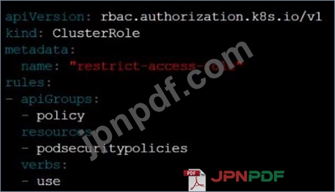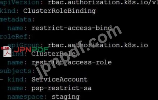 Finally, create a new ClusterRoleBinding named restrict-access-bind, which binds the newly created ClusterRole restrict-access-role to the newly created ServiceAccount psp-restrict-sa.