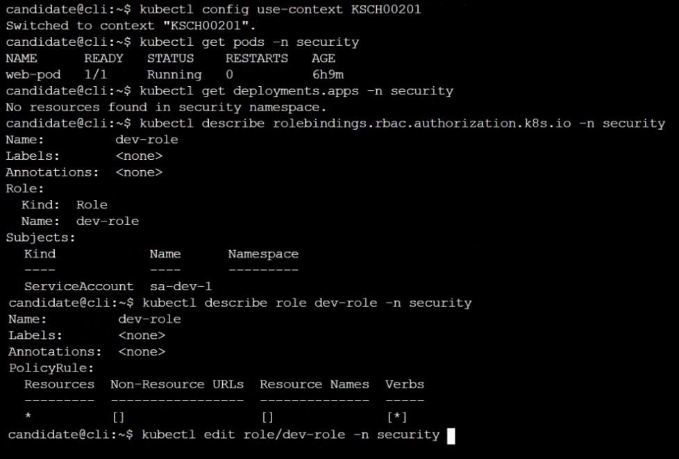 A Role bound to a Pod's ServiceAccount grants overly permissive permissions. Complete the following tasks to reduce the set of permissions.