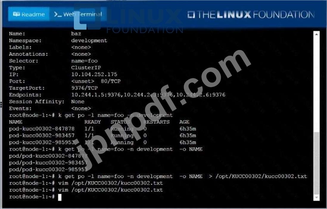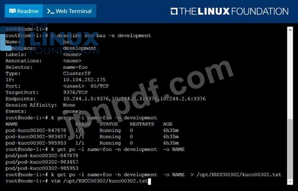 /opt/KUCC00302/kucc00302.txt には、名前空間開発でサービス バズを実装するすべてのポッドがリストされます。