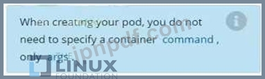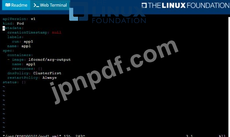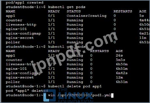 /opt/KDPD00101/podl.yml を使用して、イメージ Ifccncf/arg-output とコマンド ライン引数 -lines 56 -F を使用して、app1cont という名前のコンテナーを実行する app1 という名前のポッドを作成します。