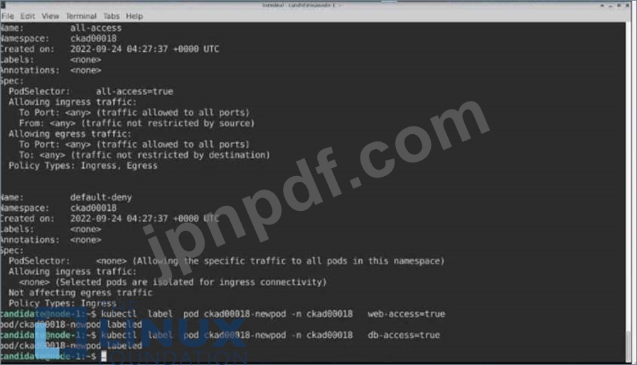 ckad00018 名前空間のポッド ckad00018-newpod を更新して NetworkPolicy を使用し、ポッドがポッド Web および DB との間でのみトラフィックを送受信できるようにします。