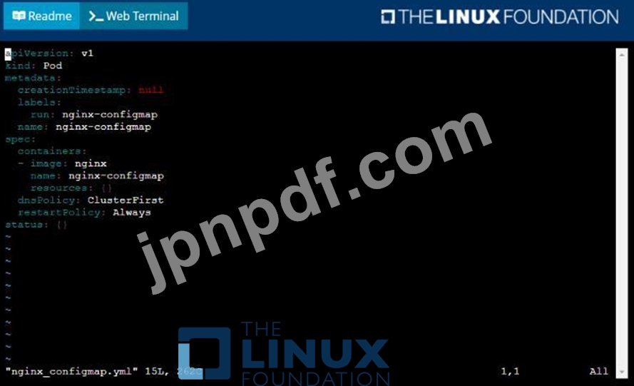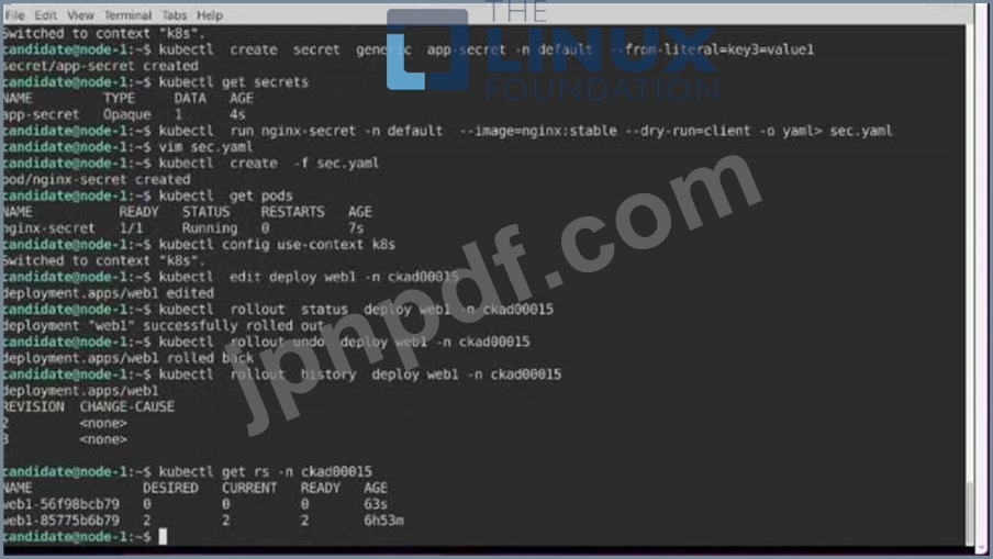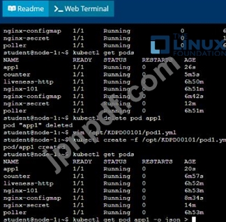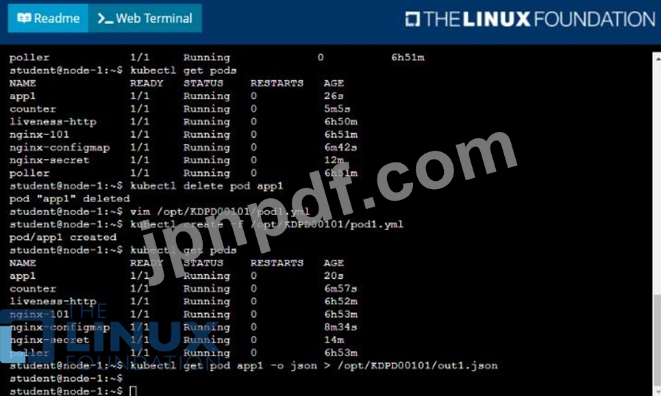 * ポッドの実行中に、kubect1 コマンドを使用してポッドに関する概要データを JSON 形式で表示し、出力を /opt/KDPD00101/out1.json という名前のファイルにリダイレクトします。