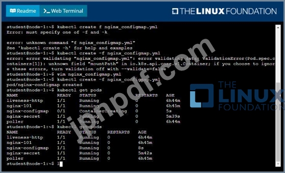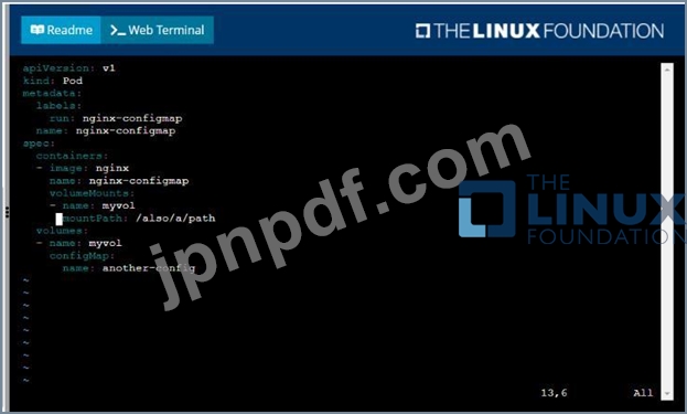 * nginx イメージを使用して単一のコンテナーを含む nginx-configmap という名前のポッドを開始し、作成したばかりのキーをディレクトリ / also/a/path の下のポッドにマウントします。以下の解決策を参照してください。