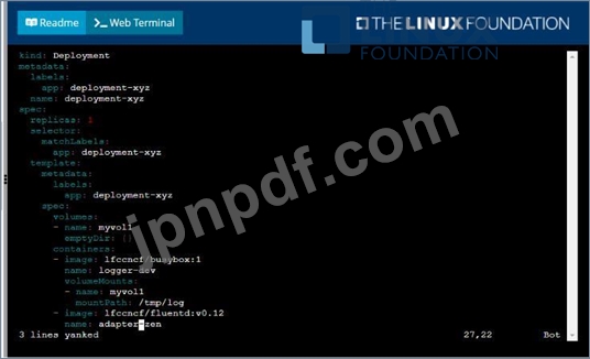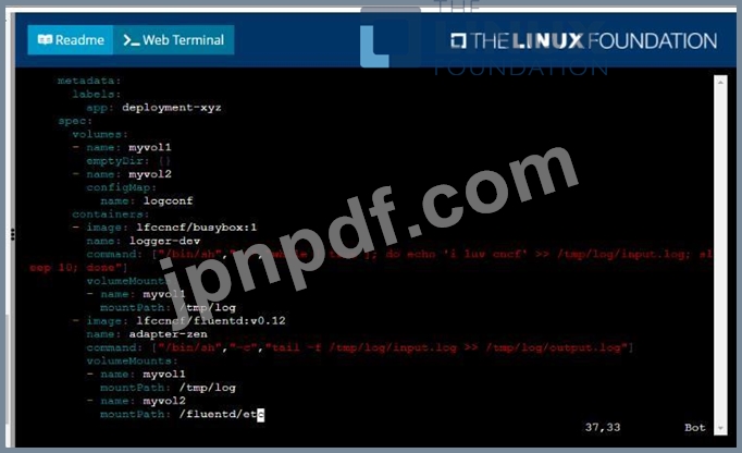 * アダプター ゼン サイドカー コンテナーは /tmp/log/input.log を読み取り、データを Fluentd JSON 形式で /tmp/log/output.* に出力する必要があります。このタスクを完了するために Fluentd の知識は必要ないことに注意してください。これを達成するために必要なのは、 /opt/KDMC00102/fluentd-configma p.yaml で提供される仕様ファイルから ConfigMap を作成し、その ConfigMap を /fluentd にマウントすることだけです。 /etc アダプター ゼン サイドカー コンテナー内 以下の解決策を参照してください。