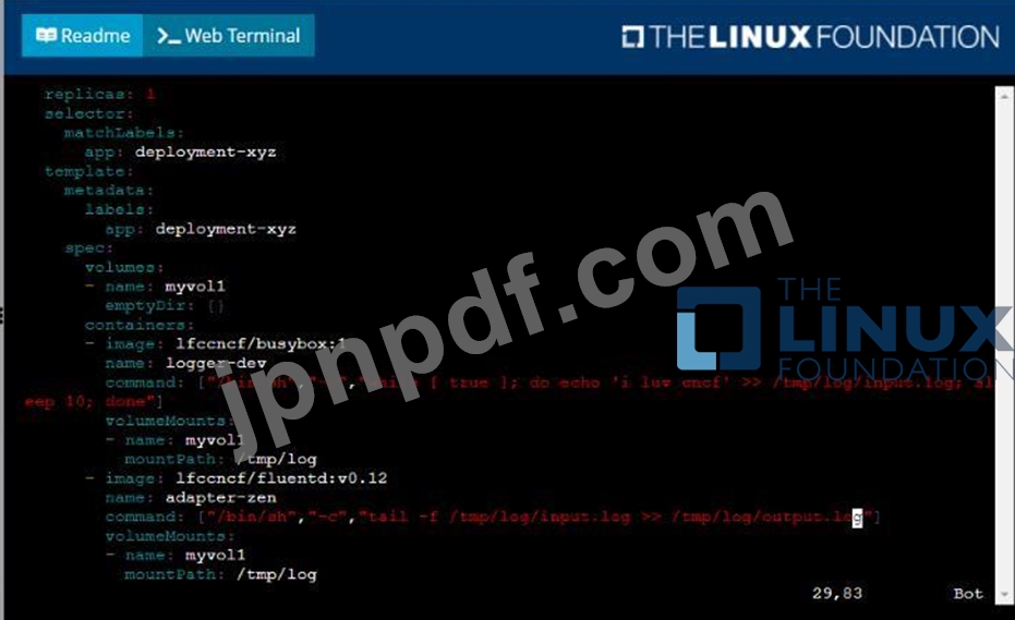*共有ボリューム /tmp/log を両方のコンテナにマウントします。これはポッドが削除されると保持されません