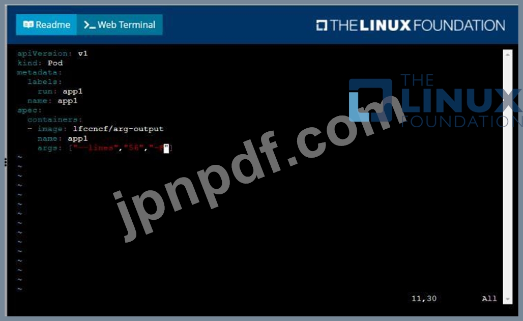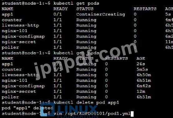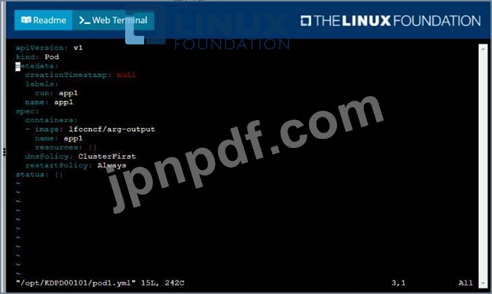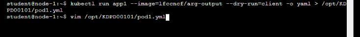 /opt/KDPD00101/podl.yml を使用して、イメージ Ifccncf/arg-output とコマンド ライン引数 -lines 56 -F を使用して、app1cont という名前のコンテナーを実行する app1 という名前のポッドを作成します。