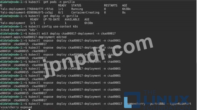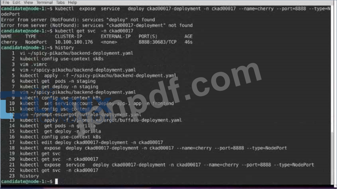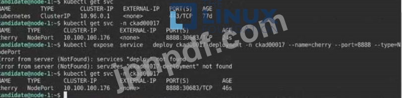 2) 次に、ckad00017 nmespace に Cherry という名前の NodePort サービスを作成し、TCP ポート 8888 で ckad00017-deployment デプロイメントを公開します。