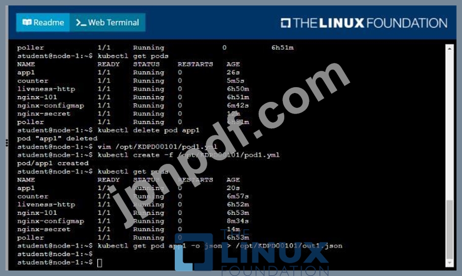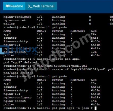 * ポッドの実行中に、kubect1 コマンドを使用してポッドに関する概要データを JSON 形式で表示し、出力を /opt/KDPD00101/out1.json という名前のファイルにリダイレクトします。