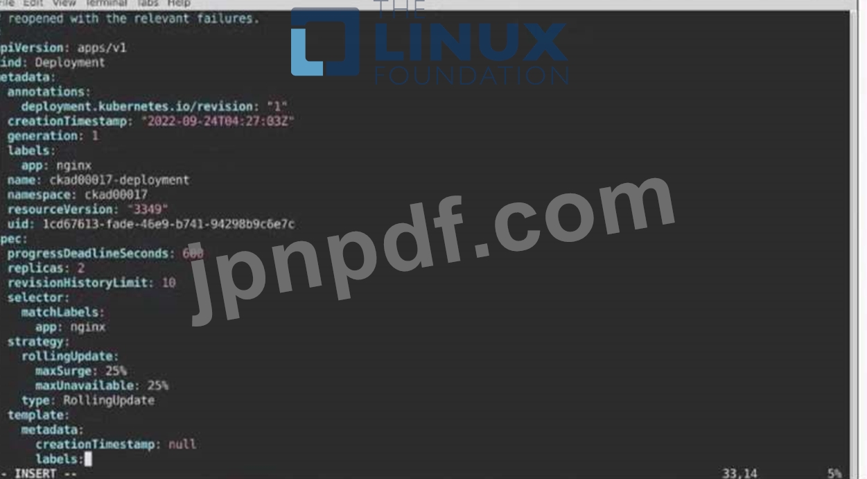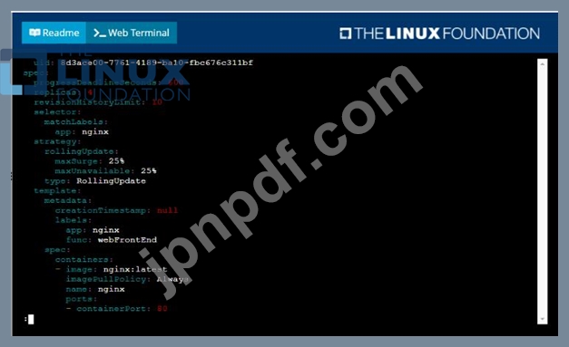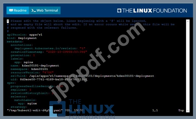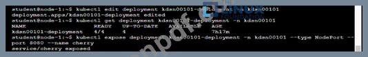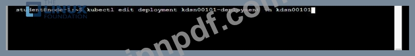 すでに名前空間 kdsn00101 にデプロイされている、 kdsn00101-deployment という名前のデプロイメントから開始します。それを次のように編集します。