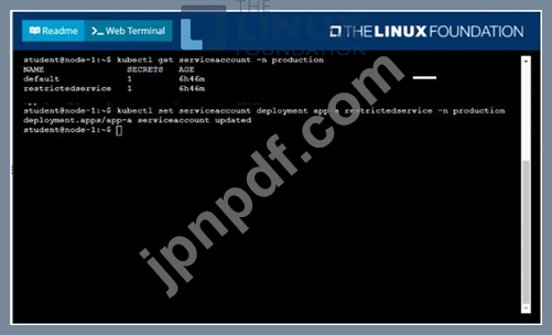 運用名前空間の app-a デプロイメントを更新して、restrictedservice サービス アカウントとして実行します。サービスアカウントはすでに作成されています。