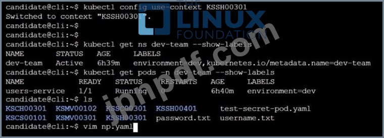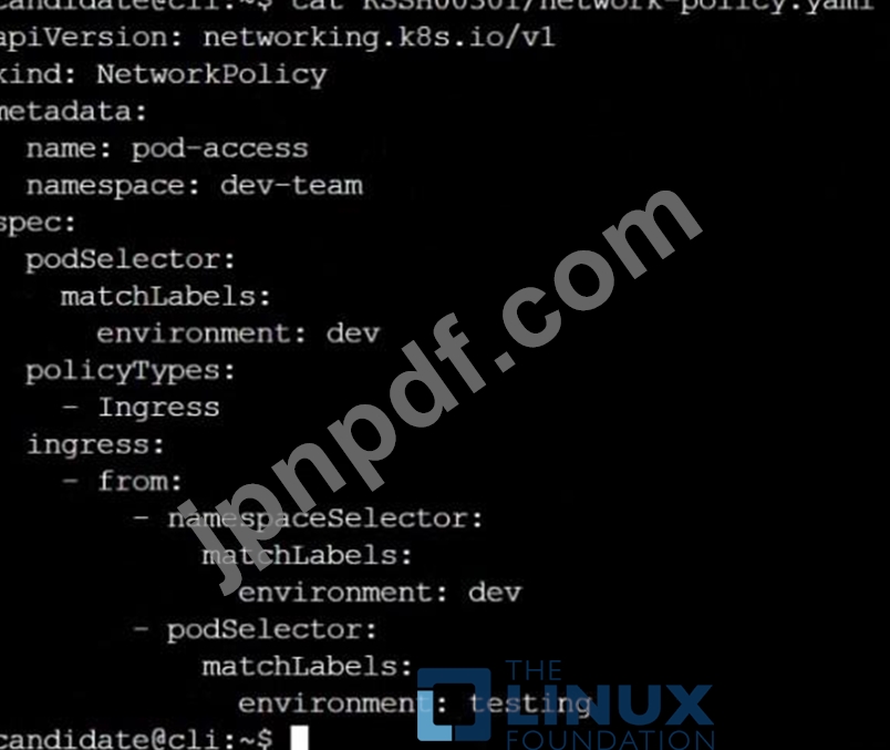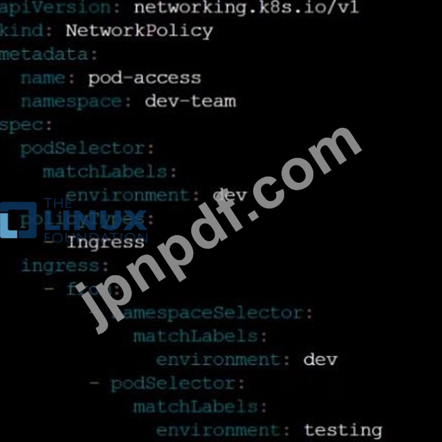 クラスター: qa-cluster マスター ノード: master ワーカー ノード: worker1 次のコマンドを使用してクラスター/構成コンテキストを切り替えることができます: [desk@cli] $ kubectl config use-context qa-cluster タスク:制限付きポリシーという名前のネットワーク ポリシーを作成して、名前空間 dev で実行されている Pod 製品へのアクセスを制限します。次のポッドのみがポッド製品サービスに接続できるようにします。 1. 名前空間 qa 内のポッド 2. ラベル環境: ステージを持つポッド、任意の名前空間