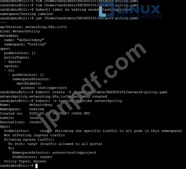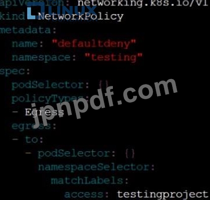 タイプ Egress のすべてのトラフィックをテストする名前空間に、defaultdeny という名前の新しいデフォルト拒否 NetworkPolicy を作成します。