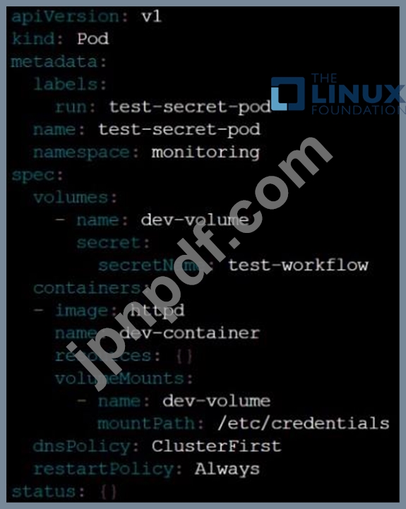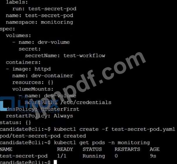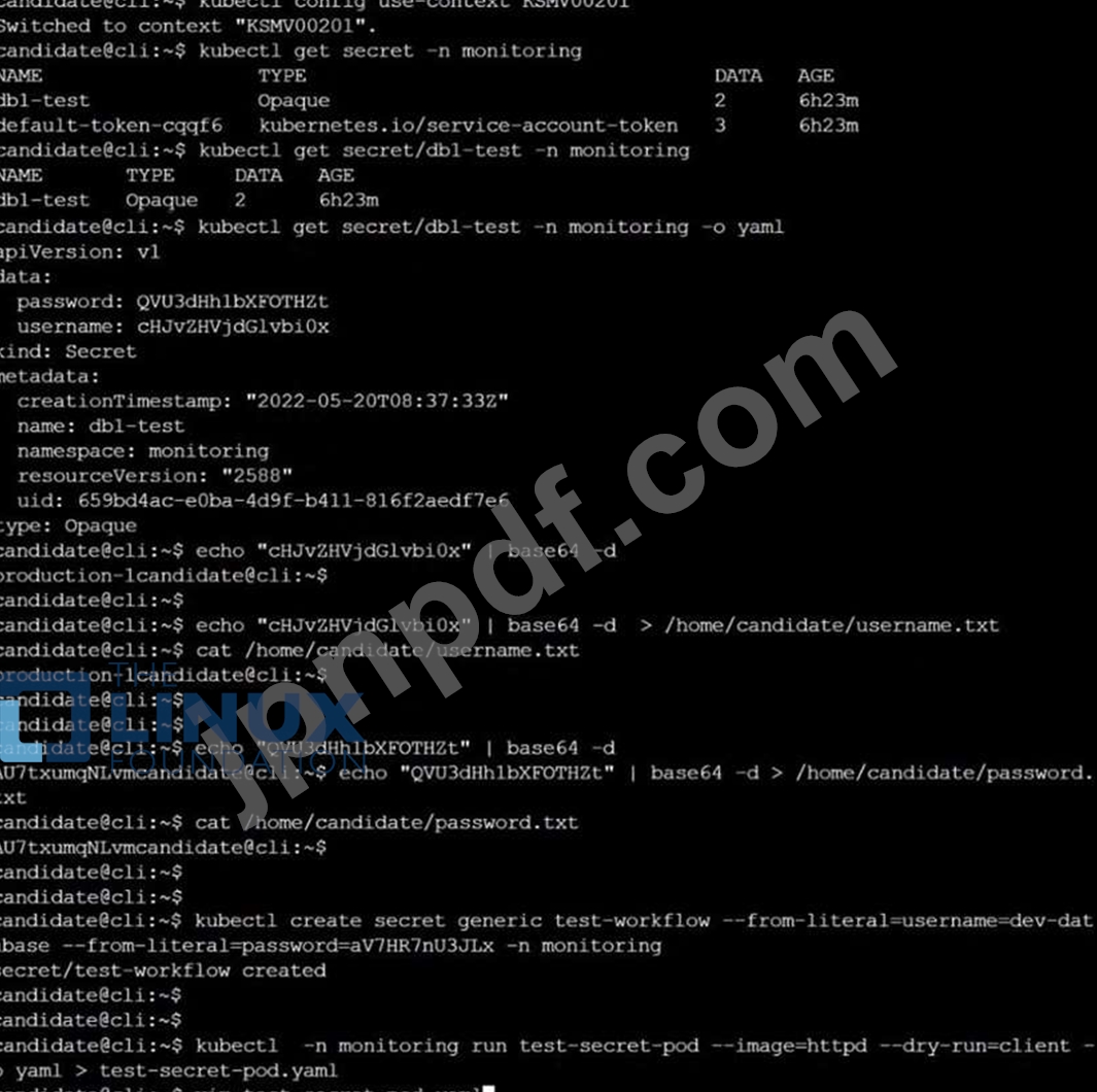 次の内容で、安全な名前空間に newsecret という名前の新しいシークレットを作成します。 ユーザー名: dbadmin パスワード: moresecurepas 最後に、ボリューム経由でシークレット newsecret にアクセスできる新しいポッドを作成します。
