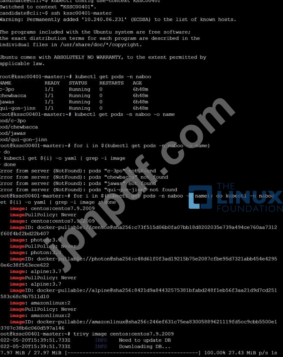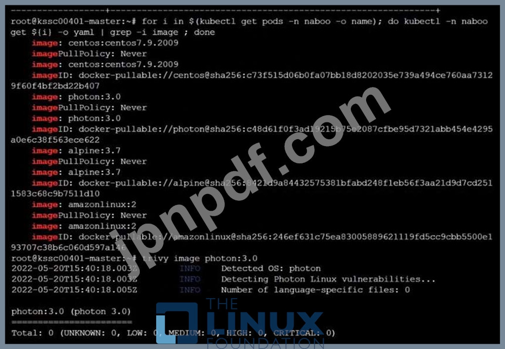 タスク: Trivy オープンソース コンテナ スキャナーを使用して、名前空間 nato のポッドによって使用される重大な脆弱性を持つイメージを検出します。