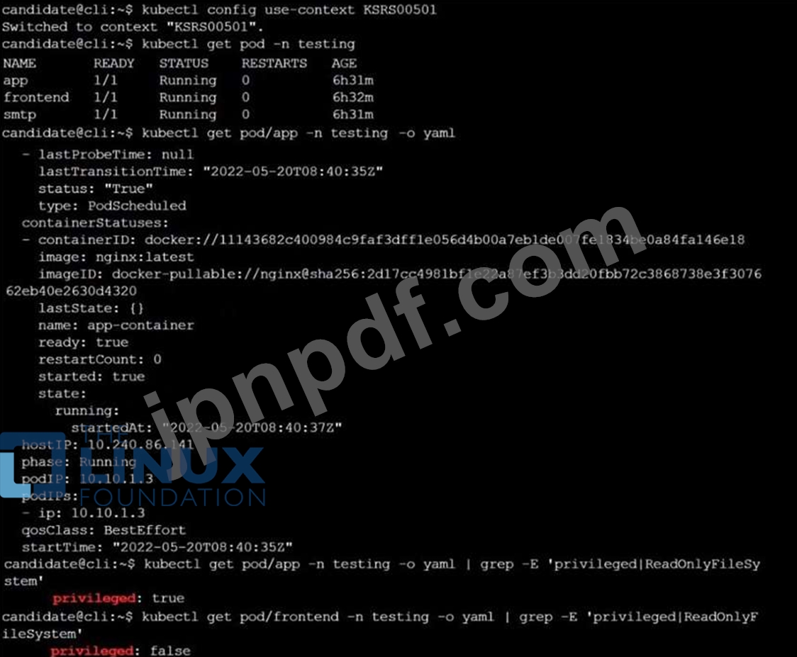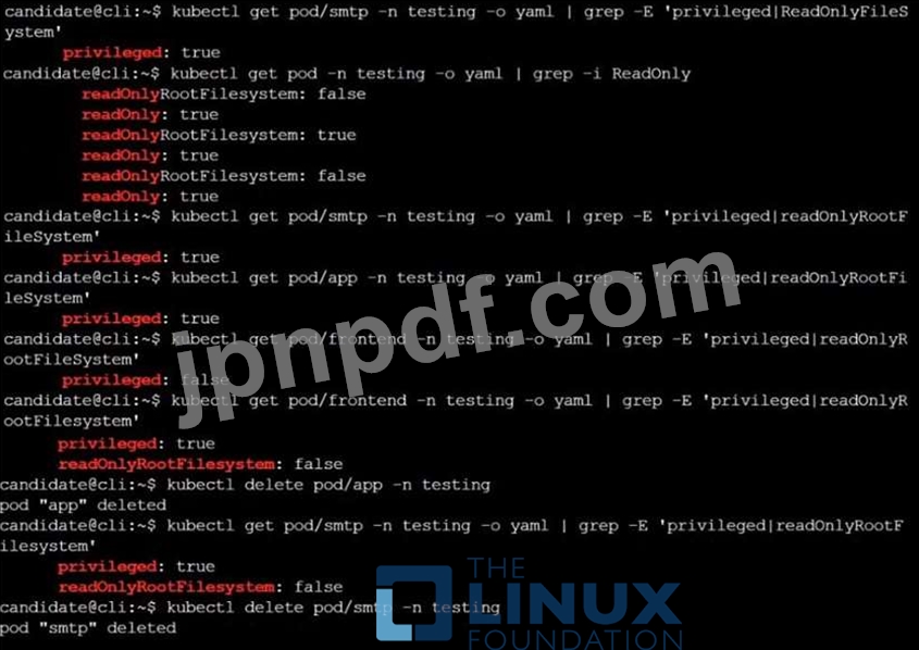 このタスクは次のクラスター/ノードで完了する必要があります: クラスター: immutable-cluster マスター ノード: master1 ワーカー ノード: worker1 次のコマンドを使用してクラスター/構成コンテキストを切り替えることができます: [desk@cli] $ kubectl config use-context immutable -cluster Context: コンテナーをステートレスで不変になるように設計することがベスト プラクティスです。タスク: 名前空間 prod で実行されている Pod を検査し、ステートレスでない、または不変でない Pod をすべて削除します。ステートレスと不変については、次の厳密な解釈を使用します。 1. コンテナー内にデータを保存できるポッドは、ステートレスではないものとして扱う必要があります。注: データが実際にコンテナー内に保存されているかどうかを心配する必要はありません。2. 何らかの方法で特権が与えられるように構成されているポッドは、潜在的にステートレスではない、または不変ではないものとして扱う必要があります。