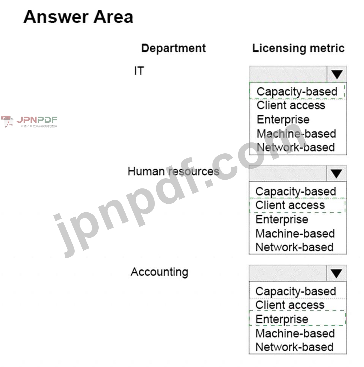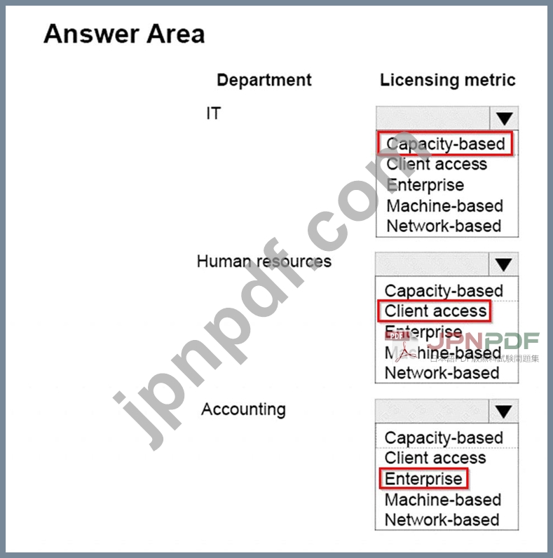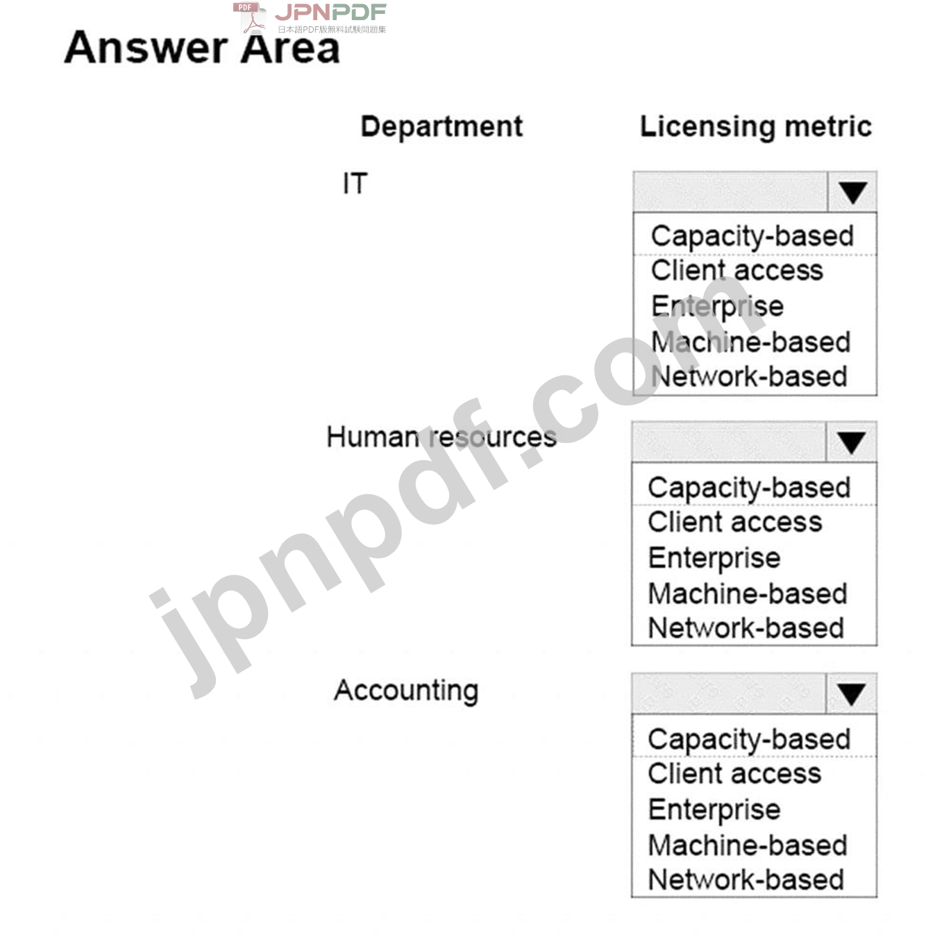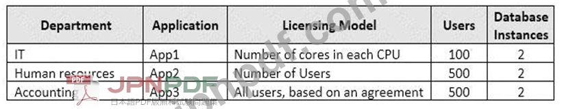 For each application, which licensing metric should you use? To answer, select the appropriate options in the answer area.