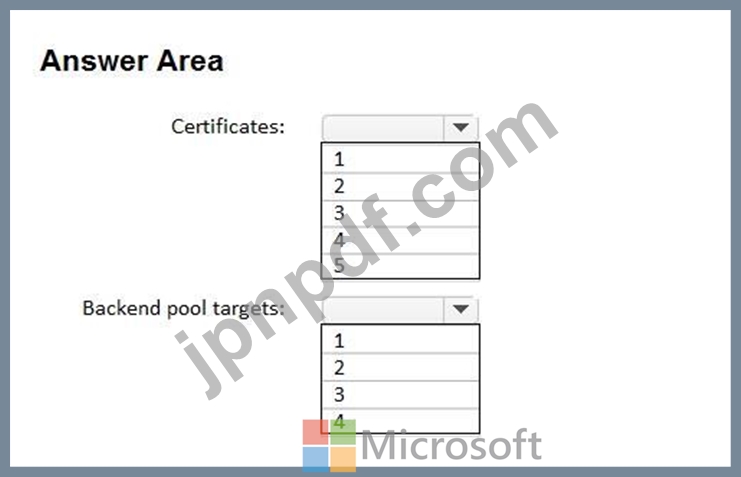 証明書にインポートする必要がある場所の数はいくつですか。また、AG1 のバックエンド プールに追加する必要があるターゲットの数はいくつですか。回答するには、回答領域で適切なオプションを選択してください。